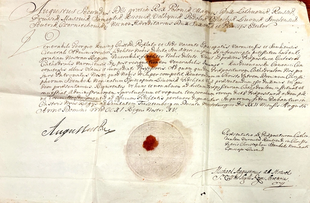 Wskazanie z 22 sierpnia 1711 r. przez króla Augusta II Sasa Krzysztofa Antoniego Szembeka, biskupa nominata inflanckiego, później prymasa Polski, brata przyrodniego biskupa warmińskiego, na prepozyturę warmińską.