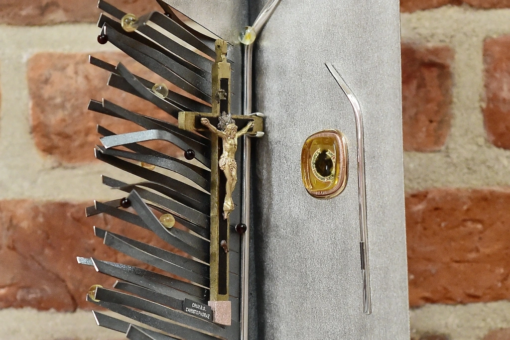 Krucyfiks umieszczony na ich tle jest relikwią, został znaleziony w grobie s. Krzysztofy. Zamierzonym efektem jego umiejscowienia jest wrażenie ukrzyżowanego Chrystusa spoglądającego w stronę relikwii sióstr męczenniczek. Łodyga tej palmowej gałązki przechodzi na kolejną kartę, tworząc zarys sklepienia przywodzącego na myśl wnętrze świątyni. Poniżej jego, na środku, niczym okno witrażowe, umieszczona została puszka relikwiarzowa. Ta część relikwiarza została zdobniczo ograniczona do minimum. W zamyśle, zabieg ten ma pozwolić patrzącemu skupić spojrzenie na wyeksponowanych relikwiach, na chwilę refleksji, czy też wprowadzić w przestrzeń do kontemplacji.