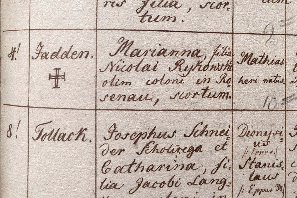 - Krzyżyki oznaczają, że było to dziecko panieńskie. To jest zawsze pewna niespodzianka dla tych, którzy przeglądają nasze księgi, bo każdy się spodziewa, że krzyżyk oznacza osobę zmarłą. Tymczasem na Warmii krzyżykami oznaczano dzieci panieńskie i dlatego mamy tylko imię matki - wyjaśnia dyrektor.