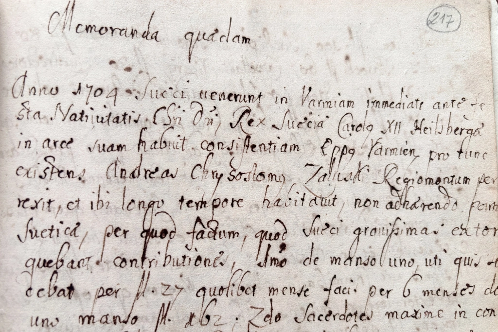 Z pewnością ciekawostką tej księgi chrztów jest fakt zapisania w niej historii wojny północnej w latach 1704-1709 r. - Jest to ciekawe też z tego względu, że oprócz tego, że podano, że biskup Załuski wyjechał do Królewca, a Szwedzi pojawili się w Prusach, jest informacja o tym, że król szwedzki zamieszkał na zamku w Lidzbarku Warmińskim. Ale też o kontrybucji, którą Szwedzi nałożyli na mieszkańców Warmii. I na przykład wiemy, ile musieli płacić kanonicy warmińscy. Zapisano, że kanonik warmiński miał płacić kontrybucji 150 florenów, dobromiejski - 100 florenów, proboszczowie - po 80, wikariusze - po 30, nauczyciele i kościelni - po 15. Nawet i takie ciekawostki tutaj są zamieszczone - przybliża ksiądz profesor.