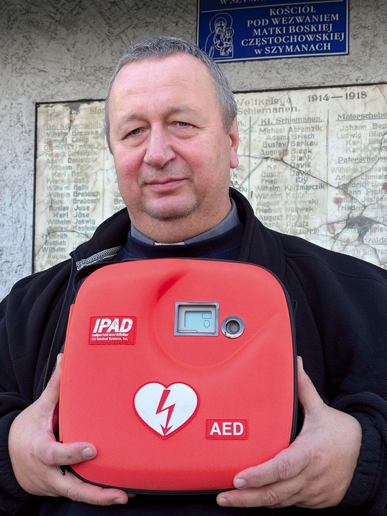 Kościół Matki Bożej Częstochowskiej w Szymanach leży przy ruchliwej trasie, praktycznie pośrodku miejscowości. Do pobliskiego Szczytna jedzie się około 10 minut. Niby krótko, ale gdy trzeba ratować życie ludzkie, może okazać się, że o kilka minut za długo. – Kiedy człowiek przestaje oddychać, a jego serce przestaje bić, co skutkuje zatrzymaniem krążenia krwi, po niespełna pięciu minutach zachodzą w mózgu nieodwracalne zmiany – tłumaczy Grzegorz Achremczyk, ratownik medyczny. – Dlatego tak cenna jest inicjatywa proboszcza, żeby na domu parafialnym, tuż obok kościoła, umieścić ogólnie dostępny defibrylator AED – podkreśla ratownik.