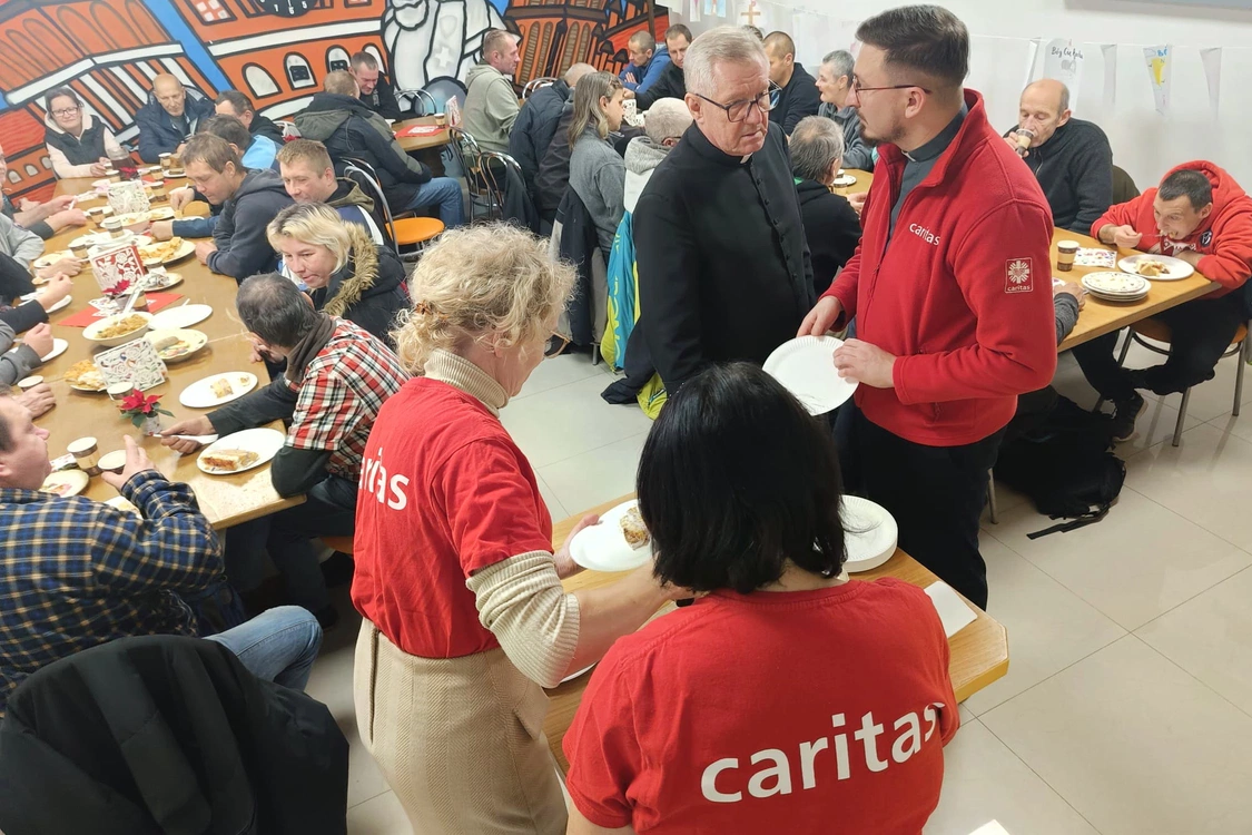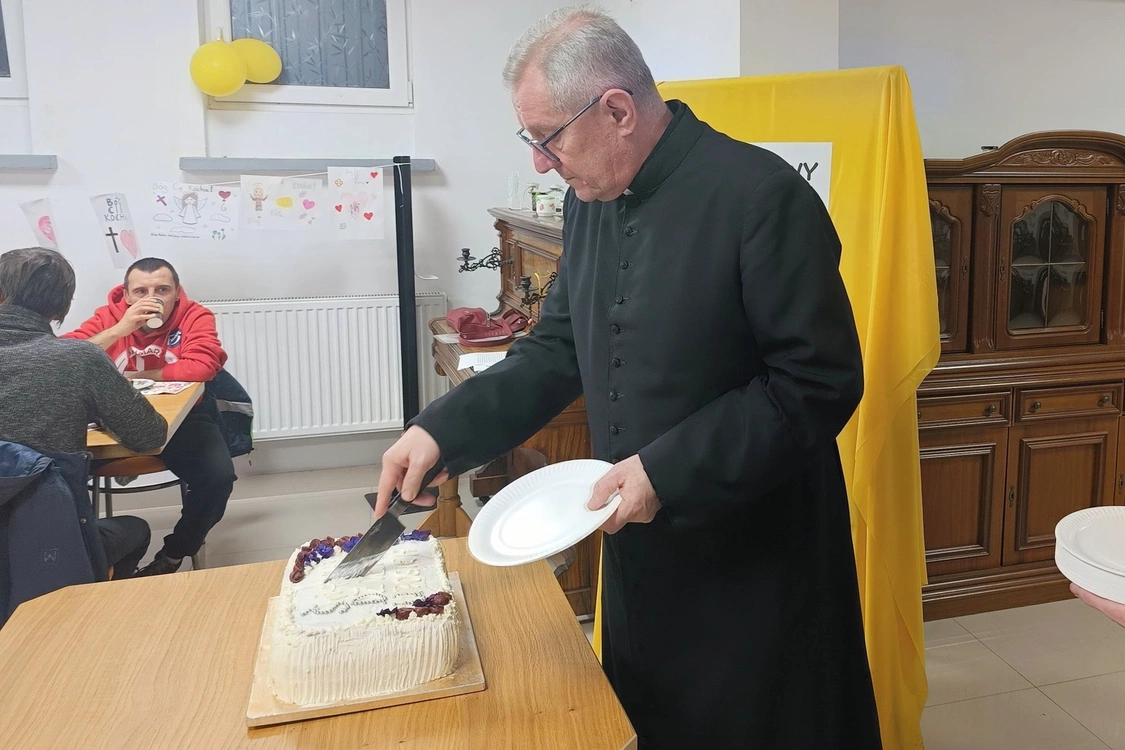 Po chwili refleksji zaproszeni goście zasiedli do stołu, a wolontariusze podali do stołu przygotowany posiłek. Ksiądz Mateusz odczytał orędzie papieża Leona XIV na Światowy Dzień Ubogich, w którym Ojciec Święty podkreśla, że „Bóg jest naszą pierwszą i jedyną nadzieją”, a wsparcie ubogich, to nie tylko kwestia miłosierdzia, a także sprawiedliwości. - Papież wskazuje, że największą biedą jest nieznajomość Boga, a dobra, choć ważne, nie wystarczają, by uszczęśliwić serce człowieka; mogą doprowadzić do przekonania, że Bóg nie jest potrzebny, bo przecież sam dobrze sobie radzę - przybliżał prezbiter.